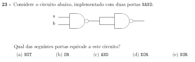 | “p e q” é equivalente a “(p NAND q) NAND (p NAND q)” | |
